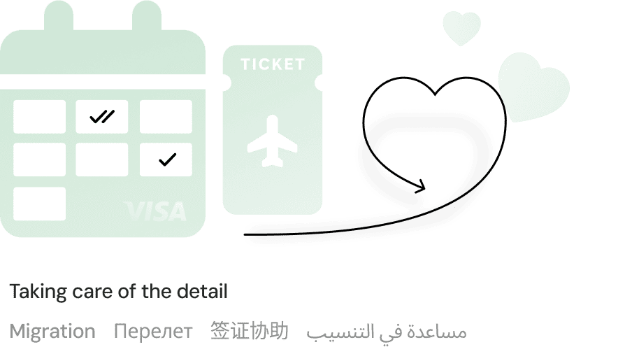 ضمن باقات Comfort Care وPremium Care، نساعد في إصدار الدعوة، التقديم على التأشيرة، حجز التذاكر والفنادق، الترجمة الطبية، والتنقلات.